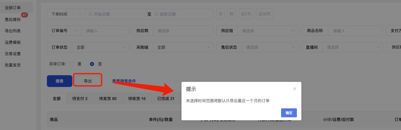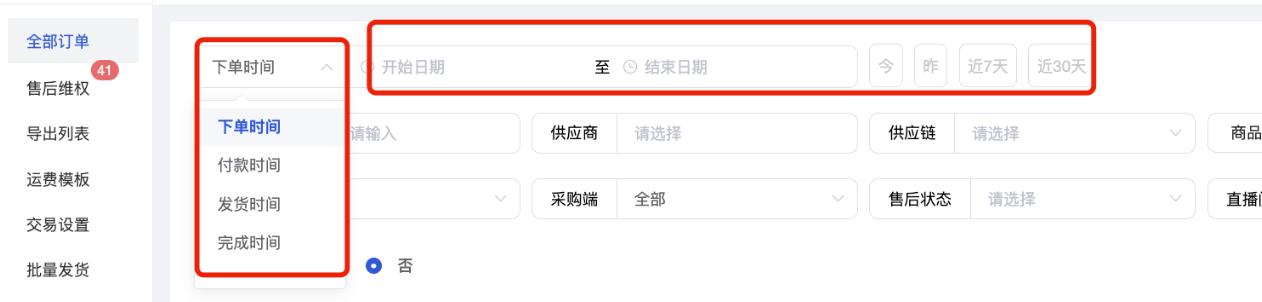 (1)时间类型:可以按下单、付款、发货、完成收货等时间段来搜索对应类型的订单。