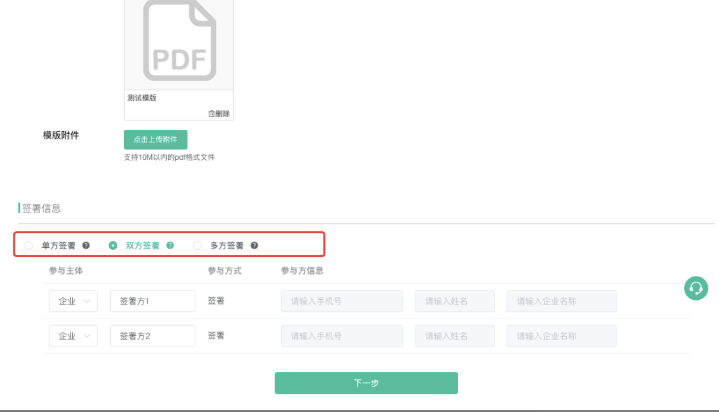 - 签署信息:选择签署方(几方签署)、签署主体(企业或个人),如选择了双方签署,使用该模版发起时对应的就是2方盖章。