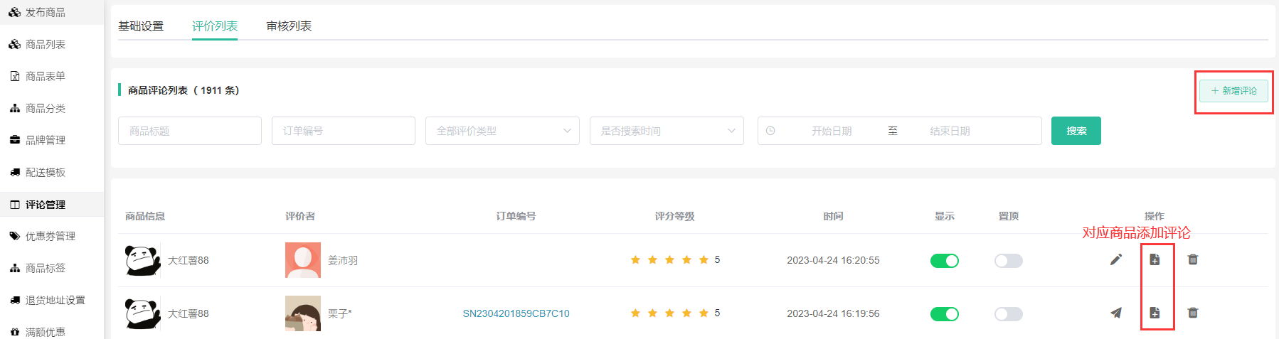 4、可以后台添加商品虚拟评价信息:用户头像、用户昵称、评分等级、首次评价等。