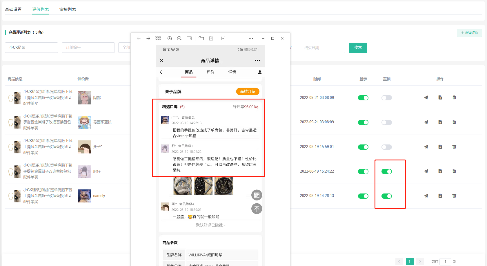 支持查看会员商品评价、是否通过审核、是否显示、是否置顶。