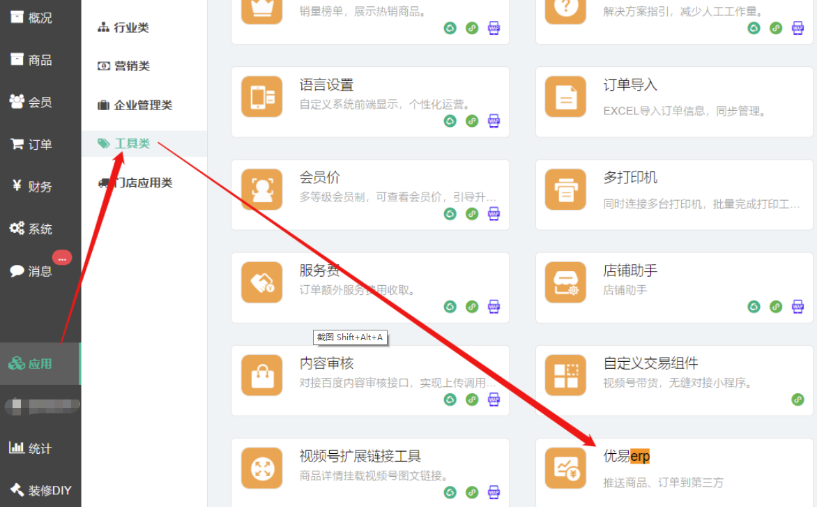后台位置:应用——工具类——优易erp
