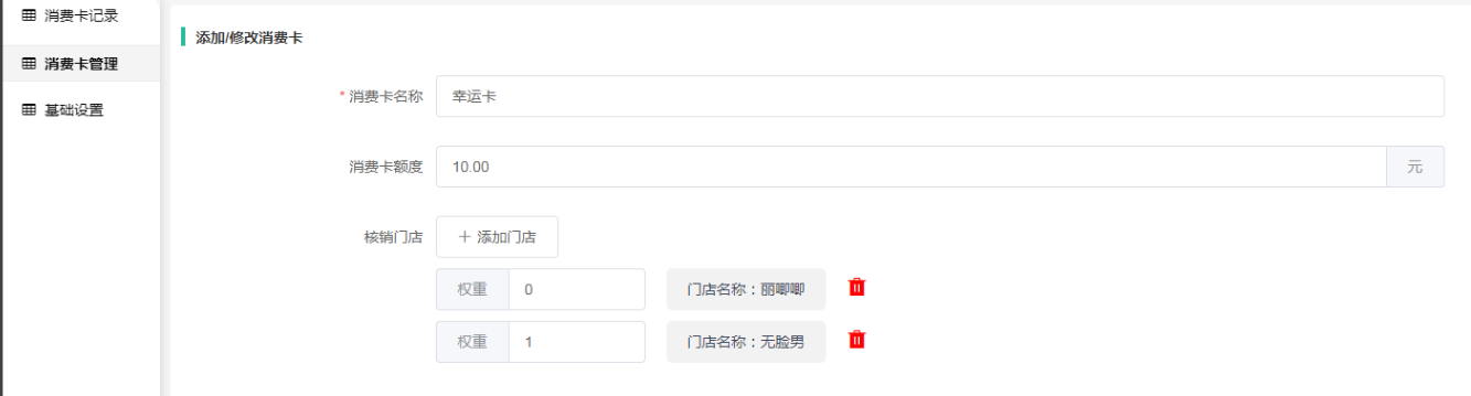 3、核销门店:可添加多个可核销的门店,按照等级权重数字排列。